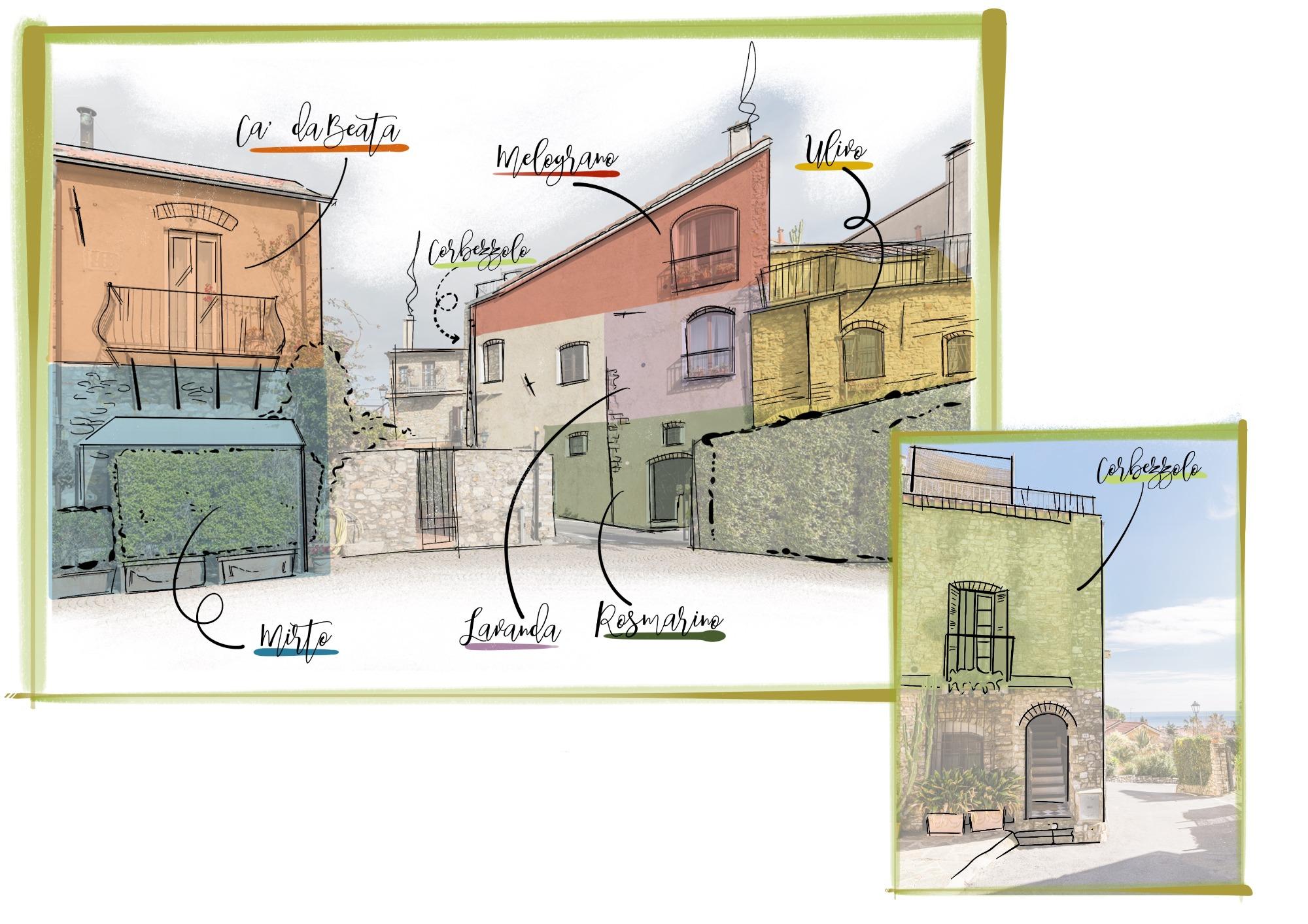 The farm is located in the characteristic village of Poiolo, 1. 2 km from the sea, reachable on foot in about 20 minutes. The structure consists of three houses: the MIRTO and CA 'DA BEATA apartments have been created in the one overlooking the garden; separated from the garden by a small village road we find the house with the apartments ROSMARINO, ULIVO, CORBEZZOLO, and LAVANDA. In the town square, next to the church, there is the old rectory SANT'ANNA